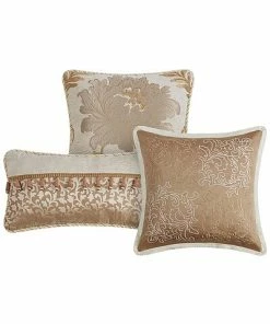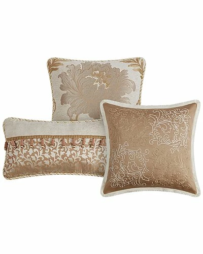 - Design details: Complete the look with the Ansonia decorative pillow set. The 12in x 18in decorative pillow features an ivory chenille and golden scroll jacquard with a beautiful ball fringe detail with a taupe poly satin reverse. The 16in x 16in taupe poly satin pillow showcases a beautiful embroidered scroll pattern reversing to a taupe poly satin. The 18in x 18in gorgeous ivory and gold chenille floral jacquard pillow reverses to a golden ivory scroll jacquard finished with ivory trim. The set includes 3 decorative pillows, pillow inserts included. Spot clean for care.