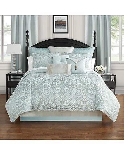 - Design details: The Waterford Fine Linens Arezzo collection is a sophisticated interlaced tile pattern in a livable dusty blue with a hint of linen reversing to a mini ogee jacquard in blue. This low luster jacquard creates a dramatic yet calming style for a master bedroom ensemble. The tailored bed skirt features a textured stripe in shades of ivory and blue finished with a blue border. Fully reversible Euro shams feature embroidery on a dusty blue ground reversing to a textured stripe. This six piece set includes a comforter, two pillow shams, two Euro shams and bed skirt. Euro sham inserts sold separately.