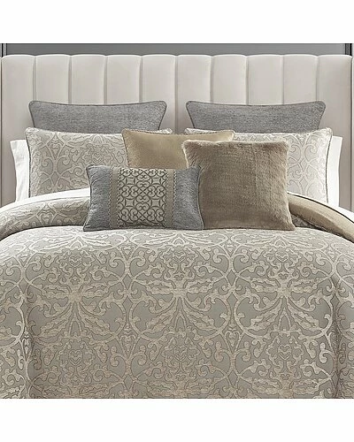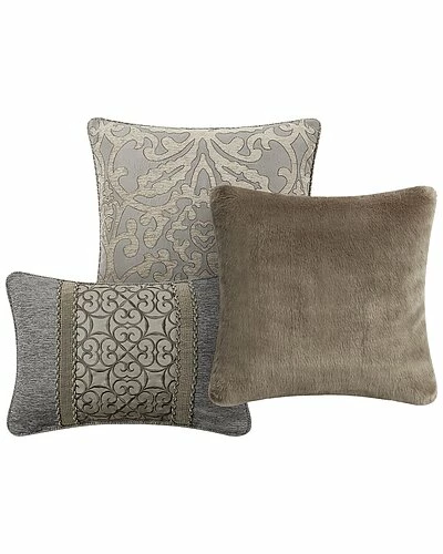 - Design details: The Carrick decorative pillow set completes the look. The 12in x 18in pillow features a vertical panel design separated by a grey gimp trim with gray textured chenille on the sides, and a champagne satin stitch embroidery in the center, reversing to a grey textured chenille. The 16in x 16in faux fur pillow comes in an elegant champagne color. The 18in x 18in pillow showcases a sophisticated jacquard damask scroll design in shades of champagne and grey with accents of chenille, and a champagne small-scaled medallion pattern on the reverse. The set includes 3 decorative pillows, pillow inserts included. Spot clean for care.