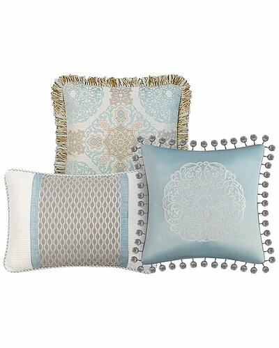 - Design details: The Jonet decorative pillow set is the perfect finishing touch to any bed. The 12in x 18in decorative pillow features a cream ogee surrounded by a beige wave textured pattern and delicate aqua felt trimming reversing to a beige wave texture. The 16in x 16in decorative pillow features an elegant, embroidered medallion on an aqua poly satin, surrounded by delicate ball fringe with a beige wave texture reverse. The 18in x 18in decorative pillow features a medallion jacquard design in elegant aqua and cream, surrounded by loop fringe with a cream ogee jacquard reverse. The set includes 3 decorative pillows, pillow inserts included. Spot clean for care.