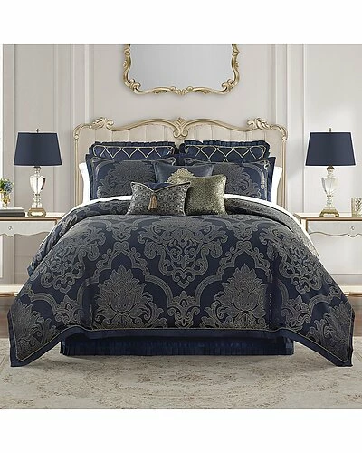 - Design details: Striking over-scaled damask with a beautiful weave technique in a deep navy mixed with golds and a hint of pale blues. The comforter and shams reverse to an updated tile scroll design and are trimmed with a woven cord in navy and gold. The Euro shams are solid navy with gold embroidery with a navy and gold textured reverse. The bed skirt is a solid navy with a ribbon and pleat detail. The six piece set includes a comforter, two shams, two Euro shams, and a bed skirt.
